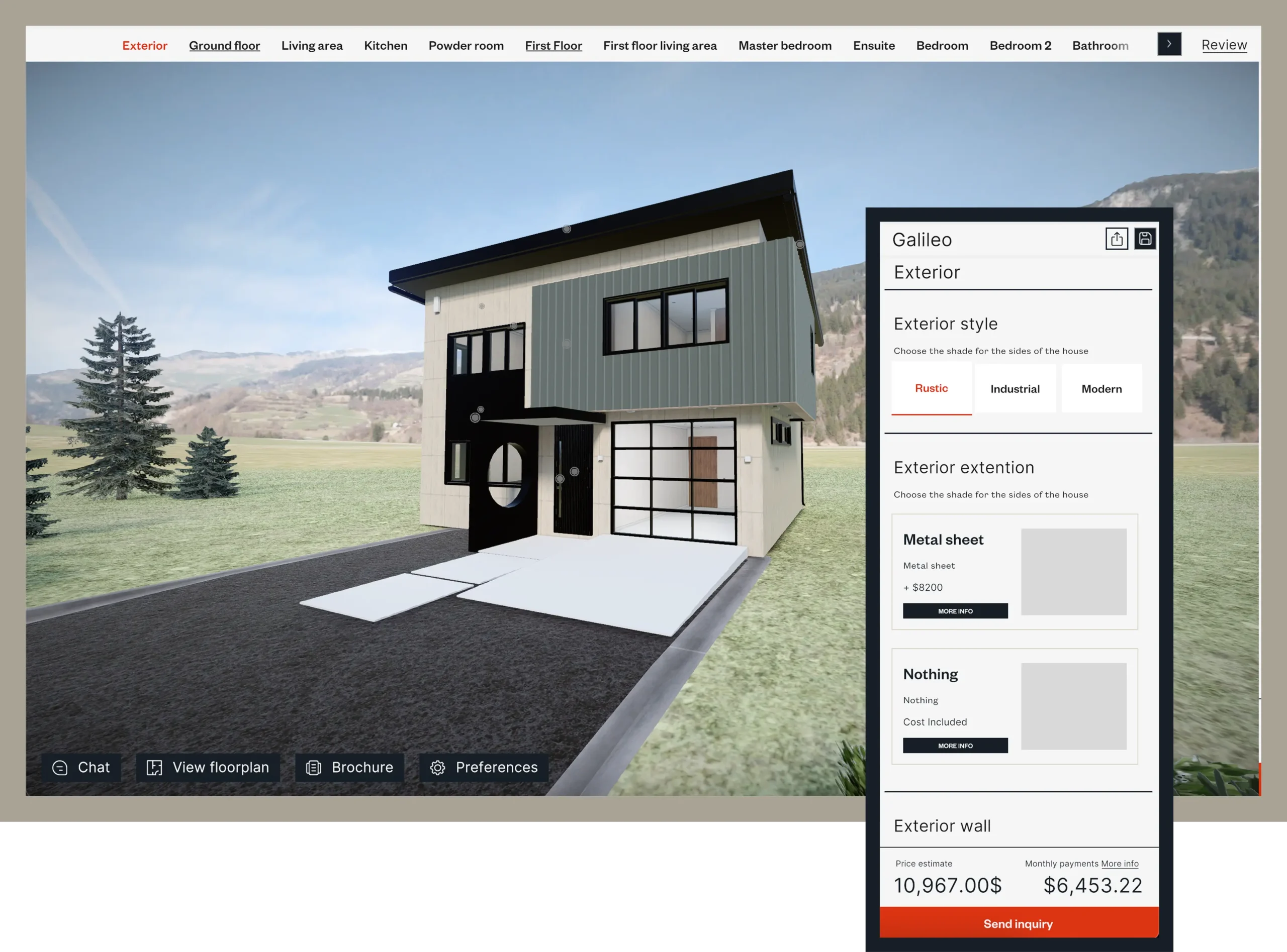 Personalize your space with our 3D configurator, choosing from curated exterior and interior style like Modern, Industrial, and Rustic.