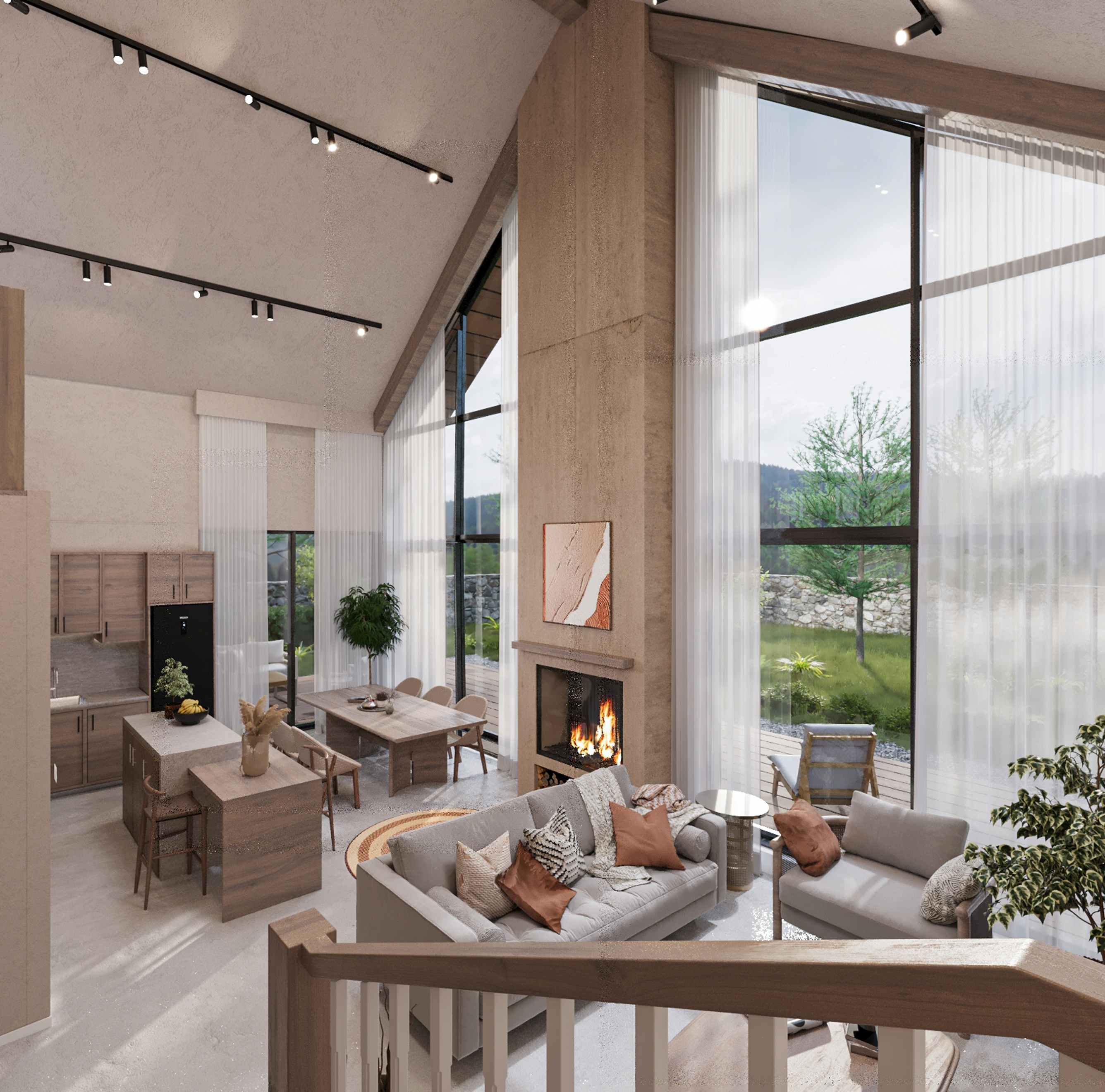 Step through the doors and you’re greeted by a soaring double-height living area that immediately sets the tone: open, elegant, and effortlessly bright. The space flows from a sleek, modern kitchen into a cozy dining area and lounge — all anchored by panoramic views that bring the outdoors in.